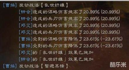 曹操的自带战法【乱世奸雄】可以为友军增加伤害,同时降低自身受到的伤害。配备暂避其锋后能够让组合同时具备增伤和减伤两种效果,对前期回合的战斗十分有利。