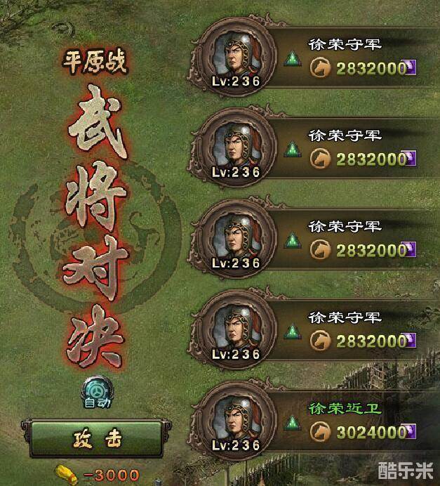 徐荣副本比较特殊,第一次攻打时候,前4个NPC的攻防血是正常水平,第5个NPC徐荣的攻防血极高,可以说“无人能敌”。第二次攻打时候,第5个NPC换成了徐荣近卫,攻防血恢复正常。这应该是系统设定。所以,攻打徐荣副本时,第一次派1个武将去即可,第2次再全员上阵、力保通关。该副本难度也不高。