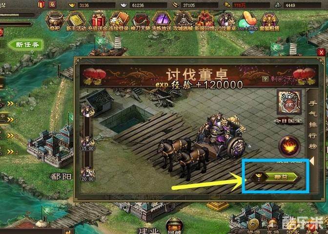 在游戏正上方打开讨伐董卓活动,在活动界面右下角点击鞭笞按钮使用它,鞭笞董卓可以得到经验或点券、宝石、国宝等。鞭笞次数可以攻击董卓营寨有几率获得,也可以使用金币鞭笞董卓。
