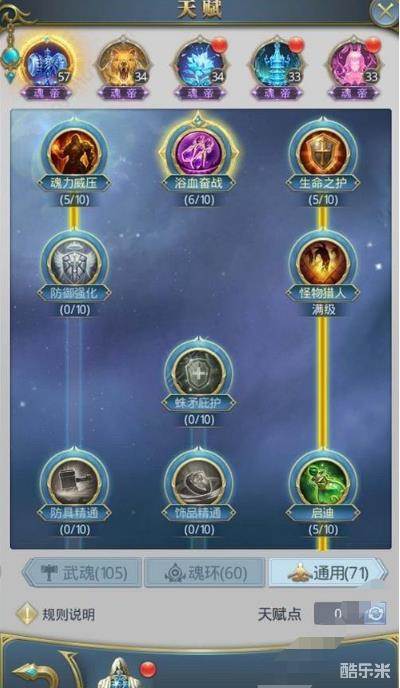通用:可以点满魂力威压、浴血奋战、生命之护、怪物猎人、启迪、防具精通、生命强化等等,可以提升防御能力,还有各种属性的提升,效果还是比较明显的。