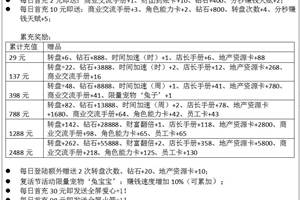 活动名称:首富‘童心嘉年华’活动开启时间:2020年05月29日凌晨00:00活动时间:2020年05月29日至2020年06月03日活动范围:全服活动内容:l每日首充2元即送:角色能力卡+1、员工卡
